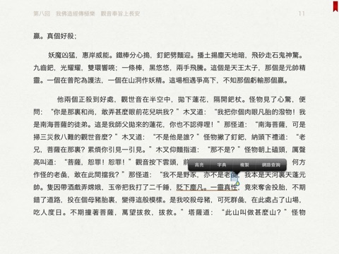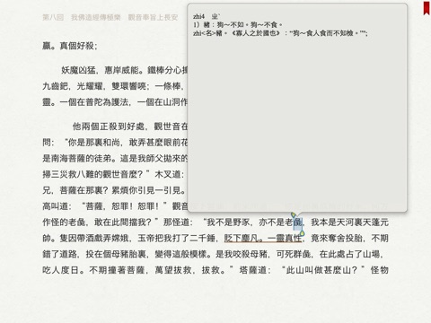 Appstore上罕見的《西遊記》應用: 邊聽邊看、真人朗讀、 文字實時同步、即指即播、自動翻頁、朗讀變速變調、字典查詢、間繁切換、精美的字體, 清新的界面! 老少皆宜, 是值得收藏的版本!