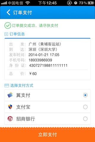 3、可通过翼支付、支付宝、银行卡等方式在手机上支付票款;