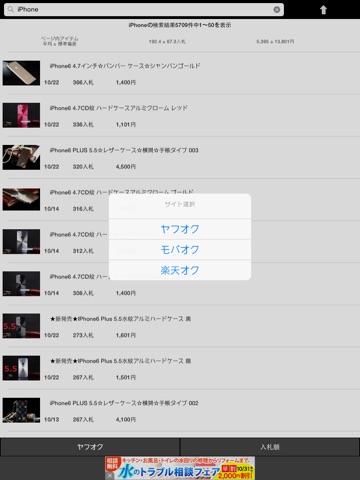 ヤフオク(Yahoo!オークション)、モバオク、楽天オークション(楽オク)の落札アイテムを対象として検索することが出来ます。