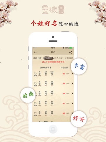 3.起名同样是根据传统姓名学知识,通过层层信息的筛选,用自选名字,推荐名字,天降吉名,三种符合用户操作的方式。总有一个好名让您一生顺利!