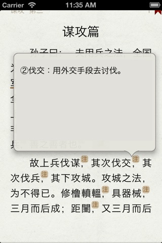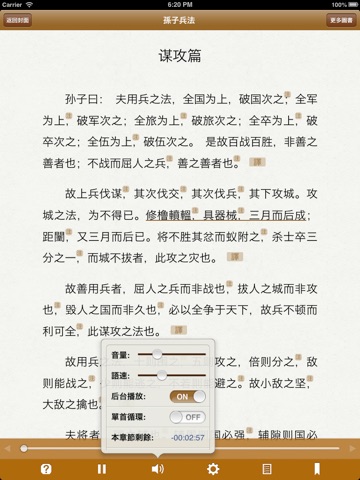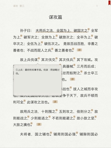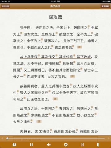 本應用為《孫子兵法》(The Art of War)有聲同步版,可聽可看, 名家誦讀, 文字實時同步, 註釋詳細,註釋與原文分離顯示,支持點查,附譯文, 以及字典。簡繁切換,壹書多用:可以聆聽充滿古韻的朗讀;亦可字斟句酌地做為學習之用;亦可以快餐方式的查看譯文,快速掌握《孫子兵法》的大意。適合各種人群,值得收藏!