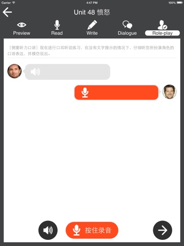 【说】:您可以和外教进行模拟实景会话练习,您选择一个角色来扮演,手机可以将您的虚拟会话录音并回放,提升您口语的实用能力。