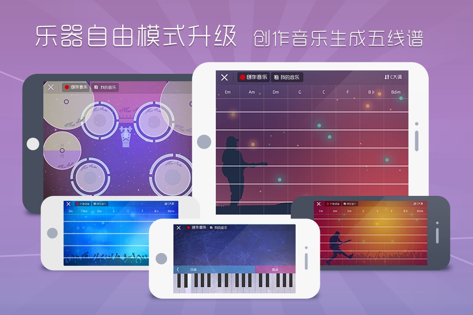 全新整合:1.钢琴、吉他、架子鼓、电吉他、贝斯快速切换,无需切换App。