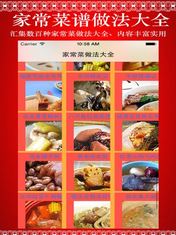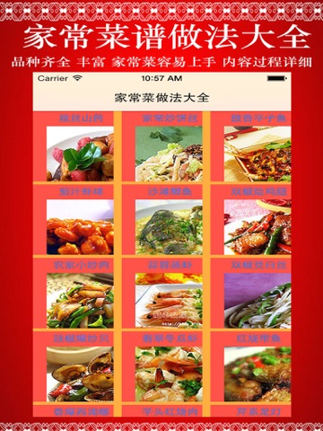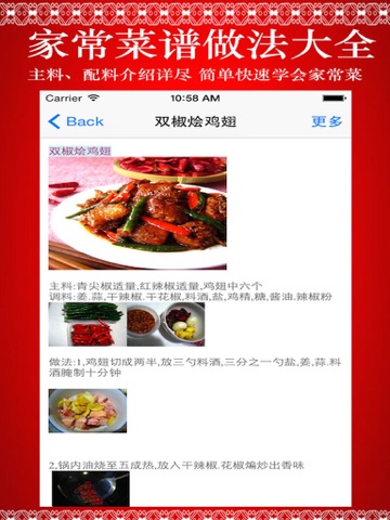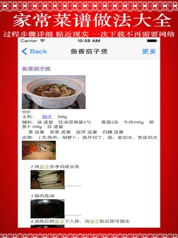 -----图文并茂介绍了近百款家常菜谱的做饭,原料、辅料、制作过程,成品截图,口味、特色等等;
