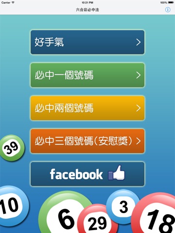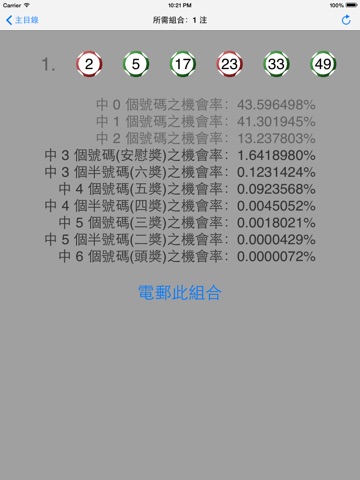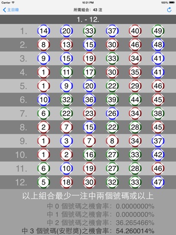 This App (Traditional Chinese only) is based on sophisticated equations to provide you with just more than 3 hundred combination entries, at least one entry is guaranteed to match at least 3 numbers (7th division prize); 43 entries match at least 2 numbers; 8 entries match at least 1 number and therefore your chances of winning the lottery prizes are significantly increased.
