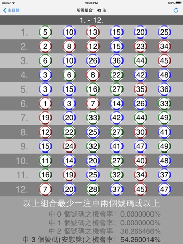 This App (Traditional Chinese only) is based on sophisticated equations to provide you with just more than 3 hundred combination entries, at least one entry is guaranteed to match at least 3 numbers (7th division prize); 43 entries match at least 2 numbers; 8 entries match at least 1 number and therefore your chances of winning the lottery prizes are significantly increased.