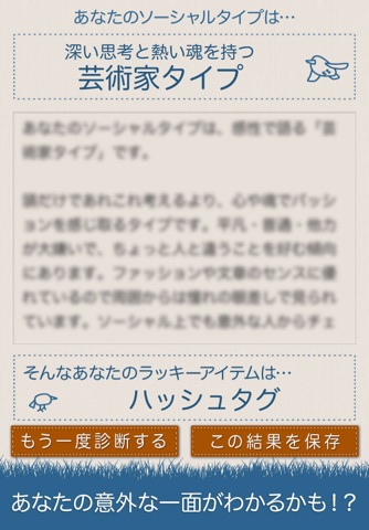 「ソーシャル診断」は、Twitter、Facebookなどの、ソーシャルメディアの使い方のタイプを診断するアプリです。