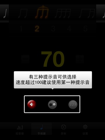 本款节拍器有3种声音可供您选择:合成提示音、人声播放(强弱)、人声模拟打拍(1234)