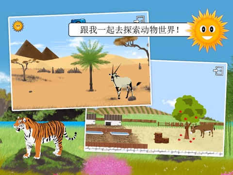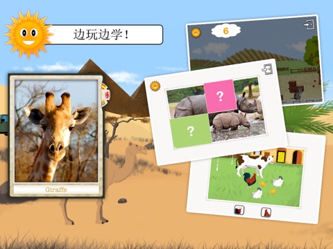 - "Where is ...": only one animal is present in the scenery: the child has to scroll to find it. A "bobble head" type card appears.