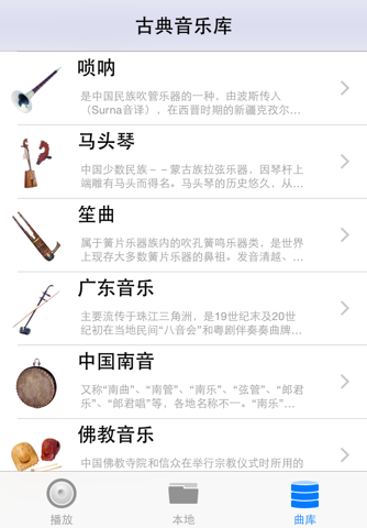 汇集上千曲中国古典音乐, 囊括所有中国古典名曲。收录古筝、笛子、二胡、古琴、琵琶、民乐合奏、吹打乐、扬琴、洞箫、葫芦丝、巴乌、丝竹音乐、埙、唢呐、马头琴、笙、广东音乐、中国南音、佛教音乐、特色乐器、中国民歌、中国戏曲、影视音乐、古诗词歌曲、配乐诗朗诵和故事音乐。