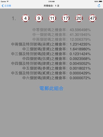 本程式經過精密運算, 提供只需三百多注組合(只限標準版)便能確保最少一注必中三個號碼(普獎)或以上、43注必中兩個號碼或以上、8注必中一個號碼或以上, 因此中獎機會亦大大提昇。