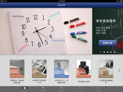 夸克商学院客户端,是夸克为广大企业管理人员打造的“随时随地学习掌握量化管理”的学习平台,同时也是个人管理能力提升的辅助工具。它收录了《企业量化管理》、《品牌量化管理》、《年度计划制定》、《战略规划制定》、《项目管理与薪酬设计》等众多精彩的影音视频课程,同时提供了大量核心的电子书和管理工具的相关资源下载。通过友好的界面设计和人性化的操作,帮助您掌握最前沿的管理思想与知识!