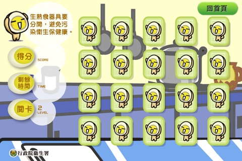 本遊戲為翻牌記憶遊戲,主要內容是要提醒民眾要預防食物中毒,以及平時培養正確的用藥習慣。遊戲共分為三階段關卡,只要翻出兩張相同的牌,一樣的牌就會一起消失,下方的米滷蛋也會作些健康小提醒,在限定的時間將所有的牌都配對消失就過關。第一關有12張牌限時60秒內完成;第二關有20張牌限時75秒內完成;第三關有28張牌限時90秒內完成,參賽者可以將自己的成積上傳,跟大家競賽,越短時間內完成的排名將會越前面,快來試試看你的記憶力!