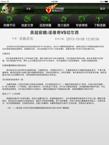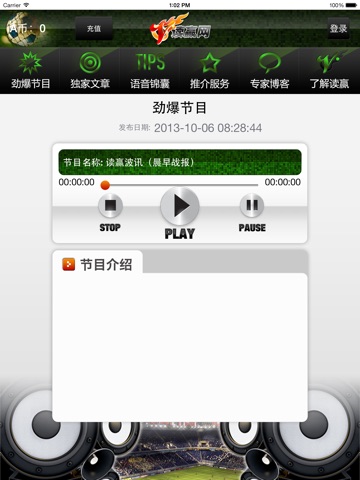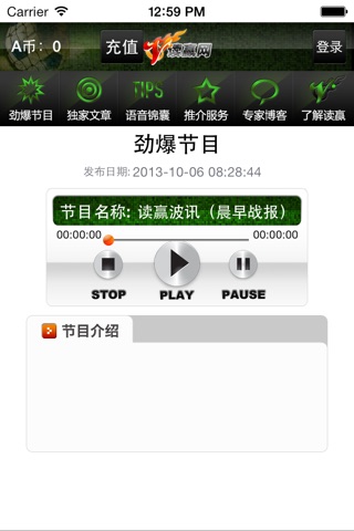本软件由知名球彩资讯网站读赢网独家开发,每天不同的时间段都会有球市大咖实时更新至新的球彩及体育情况资讯,通过本软件可以免费收听读赢网旗下品牌电台球彩节目,焦点赛事的赛前点评,赛后总结,以及语音分析评论,并可以通过浏览推荐心水文章,让你足不出户也能尽享赛事激情,把握比赛先机,详情可了解读赢网,如果咨询,请致电:400-996-3833。