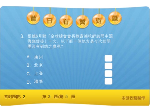 特此聲明:由2012年8月份開始推出的「有獎遊戲」,由《末世牧聲》部門負責製作及更新,全答對「有獎遊戲」的首五位參加者之獎品,由本機構負責送出,與蘋果公司無關,同時本機構亦絕對不會使用蘋果公司的產品作為「有獎遊戲」之獎品。