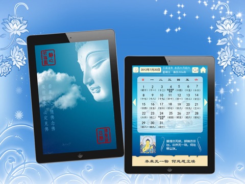 ----阳历、农历、佛菩萨圣诞日、斋日随时查看,另外还包含佛菩萨圣诞日、斋日的提醒功能。