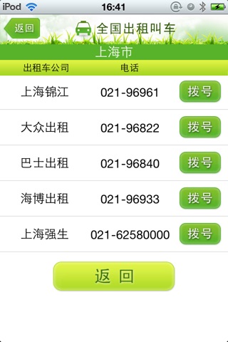 本软件收集全国100个重点城市的出租车叫车电话,方便出行。(北京、上海、天津、重庆、合肥、蚌埠、阜阳、芜湖、马鞍山六安、安庆、淮南、黄山、福州、厦门、莆田、三明、漳州、龙岩、兰州、酒泉、广州、深圳、珠海、汕头、韶关、东莞、佛山、惠州、梅州、韶关、肇庆、南宁、柳州、海口、三亚、石家庄、唐山、秦皇岛、郑州、洛阳、开封、哈尔滨、大兴安岭、武汉、宜昌、长沙、株洲、岳阳、长春、吉林、南京、扬州、无锡、徐州、苏州、常州、镇江、昆山、南昌、九江、沈阳、大连、呼和浩特、银川、西宁、成都、济南、青岛、西安、太原、大同、拉萨、昆明、杭州、宁波、绍兴、香港,澳门)
