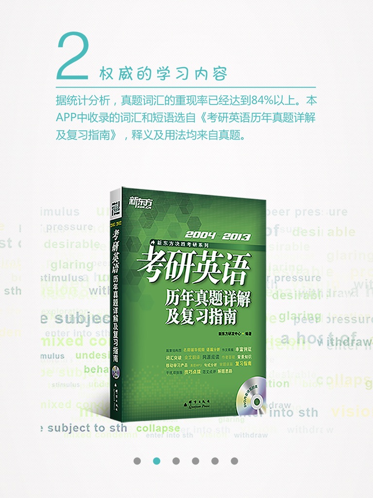 新东方考研英语真题词汇收录了《考研英语历年真题详解及复习指南》中【词汇突破】版块的所有词汇。选编词汇皆为真题中实考过的重要词汇,其释义和例句均来自真题语境。
