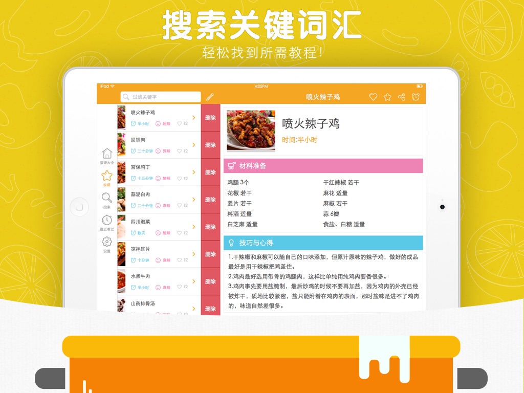 我们为你精心挑选3000多道美味佳肴。还是同样食材,但是不同的搭配、不同的调味方法以及各种让菜肴的美味扩大到极致的小秘技,让你玩转厨房,让你的生活和餐桌都一样活色生香,有滋有味吧!