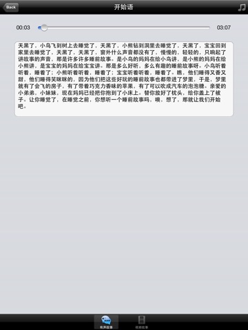 - 有声故事:103个经典童话故事,每个故事有场景音效果,逼真生动,每个故事配有中文文字对照。