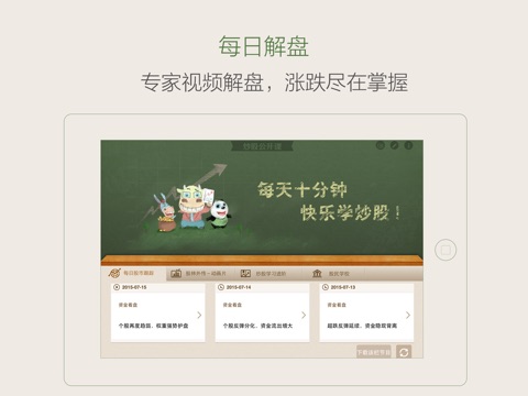 1:每天实时更新:12年经验的同花顺金融研究中心的特聘讲师们,每天视频解盘、分析当前股市热点,并提供每日一招经验传授: