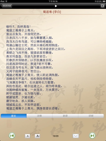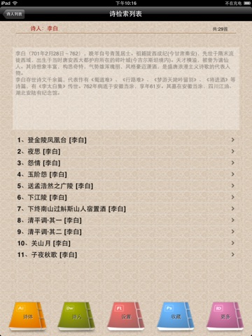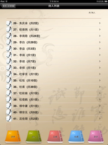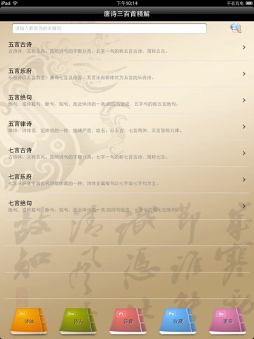 本APP中匯集了經典的《唐詩三百首》,軟件集查詢功能、詩體分類、詩人介紹、詩文朗讀、講解、評議等功能和內容為一體,內容豐富且使用便捷。