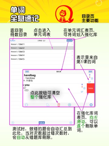 测试时做错的题目会自动进入”错题库“,当再次测试错题库的词条,且做对次数大于做错次数时,该词条会从错题库中自动删除。