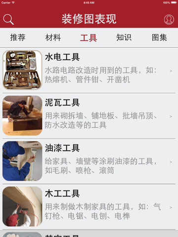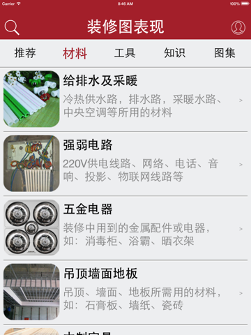 二千张图片教您认识装修材料,教您学习装修知识,教您使用装修工具,分享给您装修经验,提供全套装修效果图供您参考,让您不再为装修而烦恼,不再担心被装修工人欺骗,让您的房屋装修真正自已做主。假设装修工人告诉您买几个铰链回来,您只需用手机搜一个铰链,我们就会以图片告诉您铰链是什么,用在什么地方,安装后的效果怎样,价格是多少,一般装修要用几个,什么样的装修要买什么型号的铰链,什么地方有买等信息。您还可以用软件将装修中每一笔开销记录下来,让清楚每一笔钱都花在哪儿了。