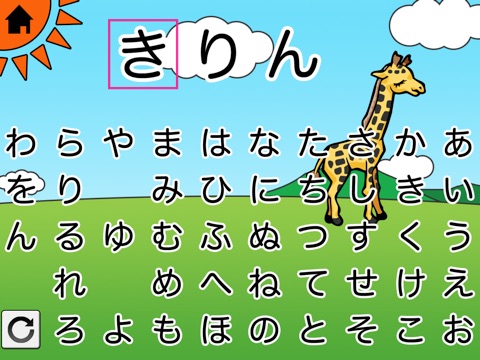 動物のイラストと例文が表示されるので、赤枠で指定された文字を、画面下部から選択してください。こどもの可愛らしい声とともに判定が行われ、正解だったら次の文字へ進めます。