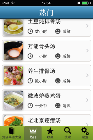 本应用精选上千道营养好喝的超级靓汤,食材简单,做法容易,并附有大厨做汤的秘诀心法,好学易做,让您用简单快速的烹调方式煲出零失败的好汤。四季经典靓汤、养生滋补靓汤、美容养颜靓汤……愿美味好汤陪您度过清爽、健康的每一天。