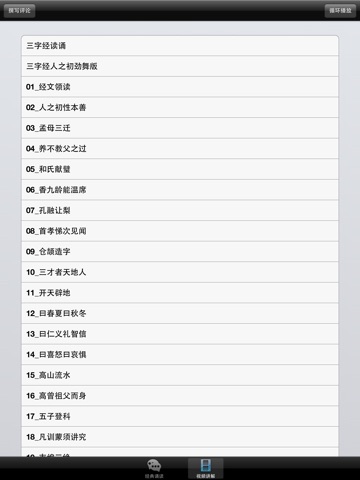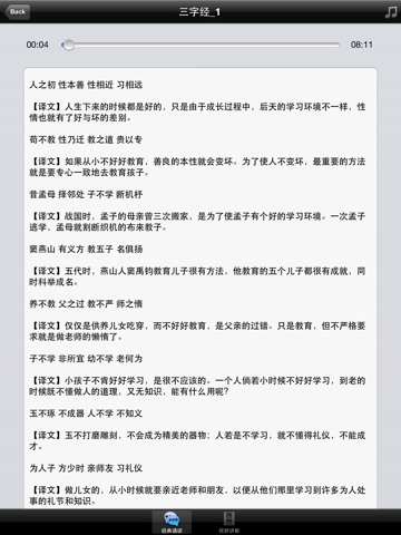 - 视频讲解:通过儿童喜欢的漫画动画形式讲解三字经的精髓,帮助儿童理解国学经典。