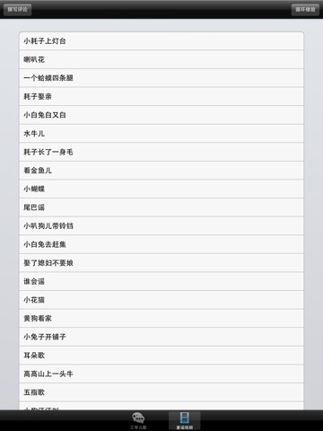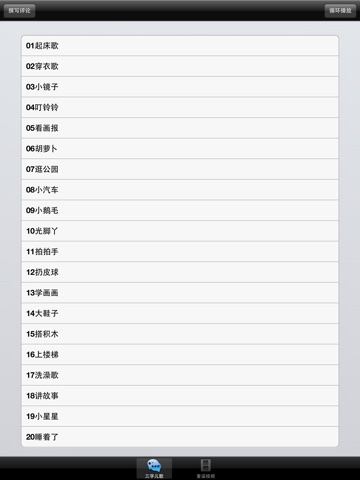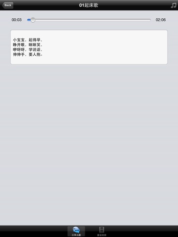- 三字儿歌:20首三字儿歌每首同时提供歌词显示。每天听这20首儿歌,当宝宝学会说话的时候,自然而然就会说这些儿歌了。