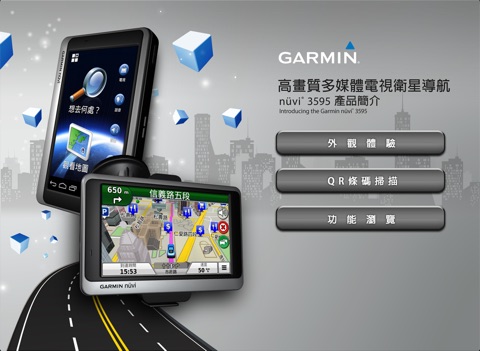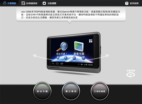 1.在Garmin nuvi3595 簡介目錄上可取得QR code條碼,欲讀取QR條碼內容請先下載本APP,若無QR條碼請至 http://www.garmin.com.tw/m/buzz/tw/minisite/nuvi3595/QRcode.html 取得條碼