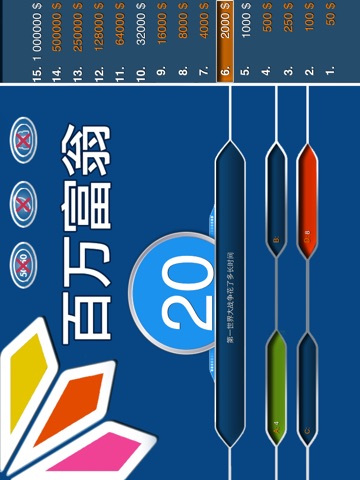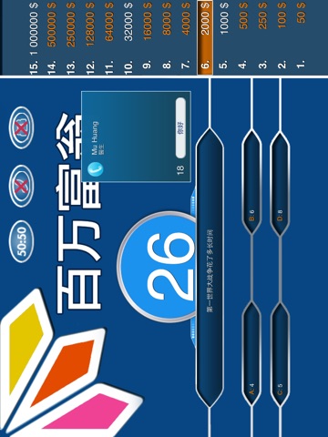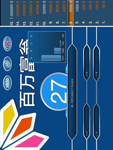 With 百万富翁, most enjoyable moments are waiting for you. With the help of iMillionaire, you can both enhance your general knowledge and have amusing time with your friends. 百万富翁 is not only a general culture competition, but an instructive and amusing application.