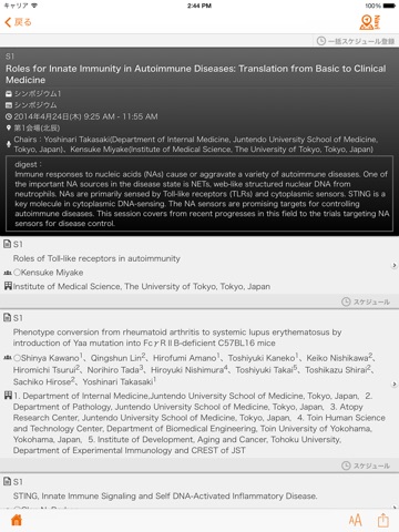 気になる講演や参加する講演は、表示されている[スケジュール]をタップすると、マイスケジュールに追加されます。