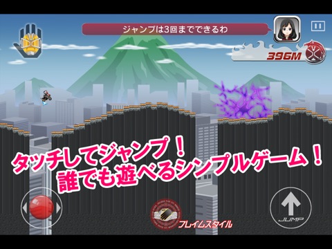 [JUMP]ボタンをタッチしてジャンプして凸凹道や崖や壁を乗り越えながらひたすら走るだけの超シンプル操作!