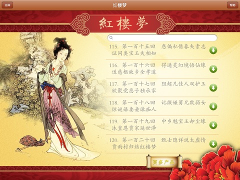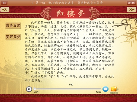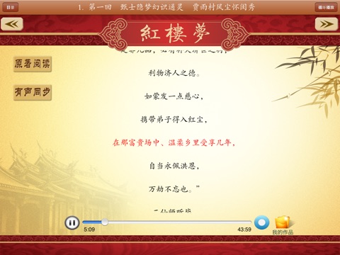 《红楼梦》,其原名有《石头记》、《情僧录》、《风月宝鉴》、《金陵十二钗》等。前80回曹雪芹著,后40回高鹗续(一说是无名氏续),程伟元、高鹗整理。《红楼梦》是一部中国末期封建社会的百科全书;小说以上层贵族社会为中心图画,极其真实、生动地描写了十八世纪上半叶中国末期封建社会的全部生活,是这段历史生活的一面镜子和缩影。是中国古老封建社会已经无可挽回地走向崩溃的真实写照。产品提供了《红楼梦》文字版阅读及由名家朗读的音频,且音频播放时歌词同步显示。同时还增加了按需下载功能,方便用户选择所需的曲目。