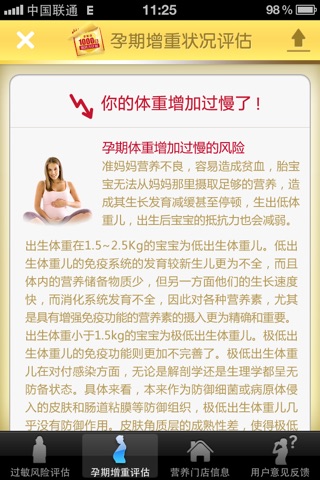 孕期健康测评包括宝宝过敏风险筛查以及孕期体重增加情况测评两大部分。它是评估准妈妈们在孕期体重增加情况的辅助工具,有助于准妈妈们通过合理营养、均衡膳食的方法来管理孕期体重。同时过敏风险筛查也有助于准妈妈们了解自己宝宝发生过敏的风险,有针对性的进行早期干预。