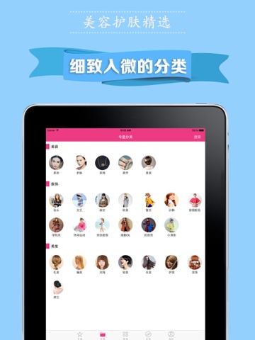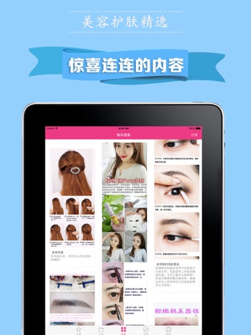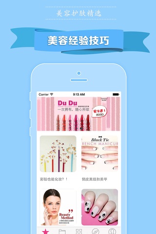 美容护肤精选 - 你的发型师美甲师和化妆师!给你精选如下内容:彩妆,扎发,护肤,美甲,发型,美体瘦身,教程,发饰,眼妆,评测!内容丰富,它就是你随身的化妆师啊!