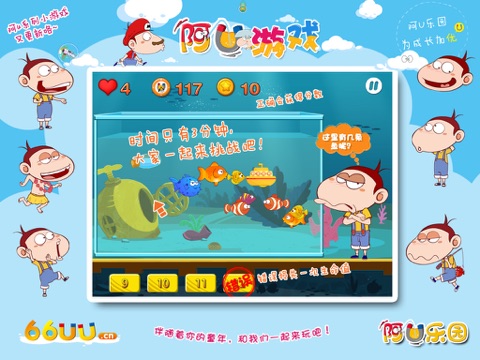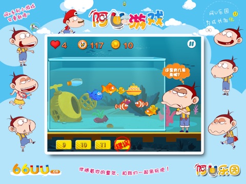 阿U的鱼缸里有好多鱼哦,快来数一数一共有多少条吧!不够多的话,阿U还要去钓!这可是考验眼力、记忆力、智力的游戏哦,小朋友们快来试一试吧!