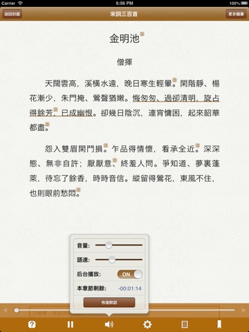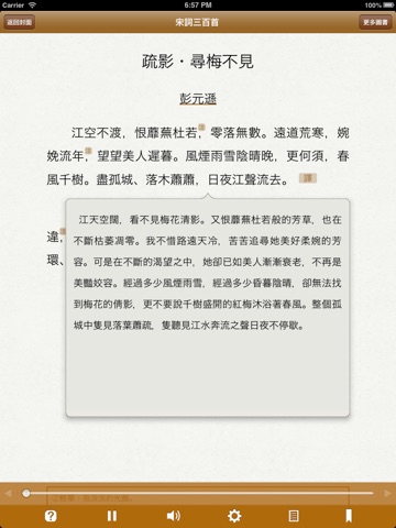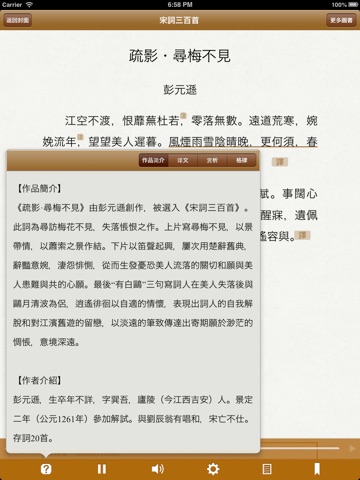 有聲同步書系列之《宋詞三百首》,可聽可看的經典,名師朗讀,字幕同步,調節語速,包含註釋,譯文,賞析,詞牌格律等。 支持點查,壹書多用,老少皆宜。