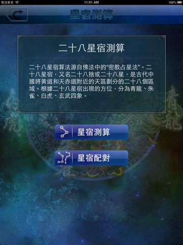 根据二十八星宿出现的方位,分為青龙、朱雀、白虎、玄武四象。想知道你自己的守护星宿么,想知道你和对方的星宿配对么?快来下载吧。