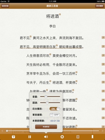 有聲同步書系列之《唐詩三百首》,可聽可看的經典,名師朗讀,字幕同步,調節語速,包含注釋,韻譯,賞析等。 支持點查,一書多用,老少皆宜。