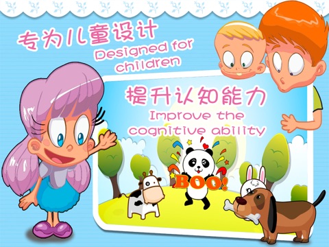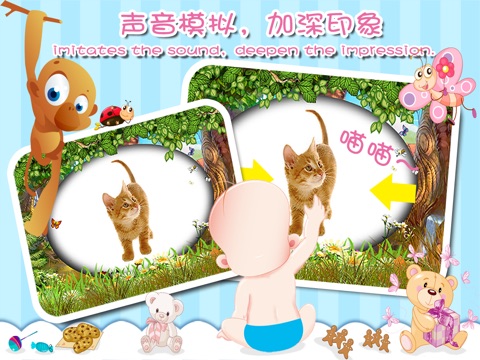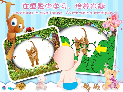 可对于成年人却很难坚持枯燥的不断重复, 也很难想到吸引孩子学习的最佳方式。本应用中,动物若隐若现躲在树丛后面, 宝宝的小手轻轻拨开树叶, 每次都是新奇的感受, 摸摸可爱的小动物, 会有动物真实的叫声而且百叫不厌。孩子们可以在玩游戏的过程中听到声音, 看到它们的真实形象, 帮助您的宝宝通过视觉、听觉、触觉全方位感知这个世界。