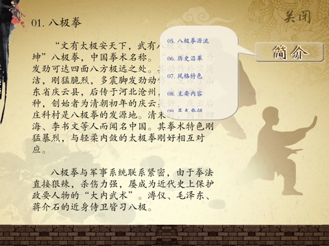 八极拳发力刚劲、爆烈骤变,跃进中以势险而夺人,进击中以节短而取胜。八极拳法已传11世,遍及华夏,涉及十数省、市、自治区,还传至日、美等国家和地区。