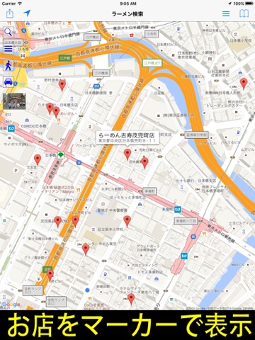 現在地付近の地図にラーメン店をマーカーで表示します。