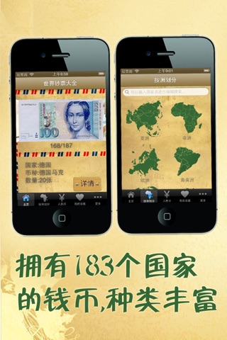 Appstore上最全的世界钞票大全,在财务类分榜排名连续排名前茅,拥有183个国家的钱币,每个国家的钱币有高清数张,共有1490张高清钱币图片,从纸币到铸币种类齐全。