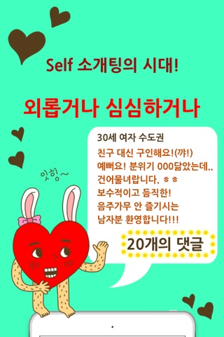 - 혹시 외롭거나 심심하거나 하진 않으세요? 감.친.연.에선 셀프소개팅도 가능합니다. 실시간으로 올라오는 훈남훈녀들의 셀프소개팅 정보를 놓치지 마세요!