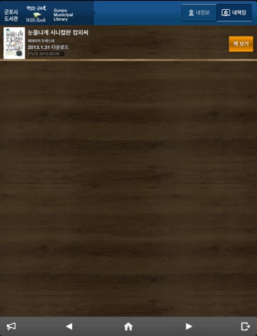 군포시도서관의 도서이용 서비스를 스마트 폰에서 손쉽게 사용할 수 있도록 구성하였습니다. 도서의 검색에서 시작하여 도서 대출현황, 예약, 신청 등 도서관에서 이용할 수 있는 기능을 군포시도서관 홈페이지를 접속하지 않더라도 스마트폰을 통하여 언제 어디서든지 이용할 수 있습니다