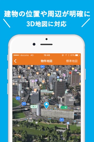 ・「3D地図」機能は、実際の街並みを衛星写真で見ながら物件周辺を調べられます。